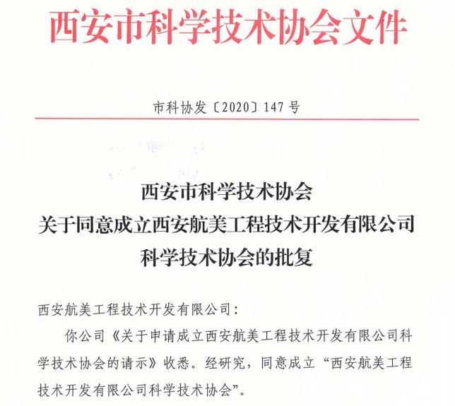 西安航美工程技術(shù)開發(fā)有限公司: 你公司《關(guān)于申請成立西安航美工程技術(shù)開發(fā)有限公司科學(xué)技術(shù)協(xié)會的請示》收悉。經(jīng)研究,同意成立“西安航美工程技術(shù)開發(fā)有限公司科學(xué)技術(shù)協(xié)會...